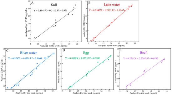 Different SDZ concentrations (10, 20, and 30 ng/mL) were analyzed in spiked samples to demonstrate the properties of the aptasensor in highly complex biologic samples. The average recovery of these samples was between 87.19% and 109.26%, and the coefficients of variation were between 3.13% and 13.14% (Table 2). Furthermore, the sensor showed a positive relationship with its HPLC (Figure 7), demonstrating that it can reliably detect SDZ in animal-derived foods and the environment. Overall, the simple synthesis process and better burst performance of MnO2 nanosheets make the developed FRET-based aptasensor simpler and less expensive, showing the promising potential of the method for application in real samples.