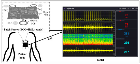 Figure 2 represents the basic operation concept of the developed patch sensor. The ECG signal is sensed using three dry electrodes (positive, negative, and RLD) and acquired using ADS1298 AFE. The H and L sound signal is sensed using a modified stethoscope head and a microphone, which is then fed to the amplification circuit to be amplified. Teensy 3.2 development board is used as the system main processing unit to control the ADS1298 AFE and communicate with it through SPI communication pins to acquire the ECG signal, as well as to digitize and process the detected H and L sound signals. The output signals from the Teensy are fed to the codec IC for encoding and decoding purposes. Finally, the output of the codec IC is displayed using a tablet-based software developed mainly for this study.