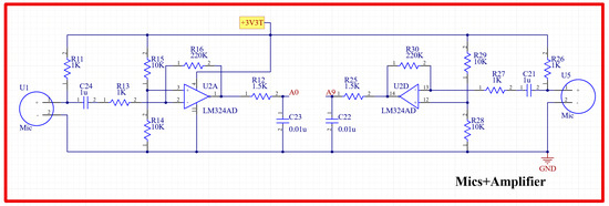The signals picked up by the two EC microphones were fed into an amplification circuitry in order to amplify them to a suitable level that could be detected by the microcontroller. The schematic diagram of the power amplifier circuit used is provided in Figure 4. An LM324 operational amplifier (Texas Instruments, Dallas, TX, USA) was used for the amplification because of its high frequency response in the frequency range of interest of this study. The amplified signals were then fed into the microcontroller to implement the adaptive filtering algorithm and, thus, ensure a noise-free signal that could further be displayed using the tablet-developed software.