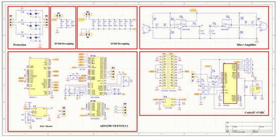 The patch acquisition and processing unit consisted mainly of four parts: the H and L sounds signal acquisition part, the ECG signal acquisition part, the Teensy 3.2 development board as the system microcontroller, and the codec IC and USB part to display the system output on the developed tablet software. These circuits’ design was formulated using Altium Designer software (version 2022, Altium Limited, Chatswood, Australia), which allows for smooth designing capability, as well as flexible PCB designing and layer stacking abilities, that meet the purpose of this study.