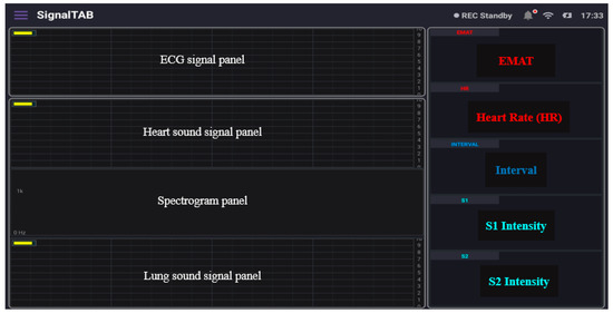 SignalTAB, which is an Android software developed for this study, was used to visualize the measured health signals of the system. It was written using Java programming language, and different panels were designed to display the collected signal, as well as some calculated parameters, as shown in Figure 8. This software was developed to be able to continuously display and monitor the collected and the derived cardiopulmonary parameters to ensure that all the processing would be done in real-time. A Chebyshev digital filter was used to filter out the acquired signals. The heart sound signal was band-pass filtered in the range between 25 and 100 Hz so that it would not mixed with the lung sound signal, and this made knowing the location from which the sound was coming easy to discern, and a sampling rate of 4 KHz was used to display it. The lung sound signal was band-pass filtered between 300 and 1800 Hz so that picking up all of the lung sounds would be achievable, even in case of abnormality, and its sampling frequency, together with the ECG signal, was set to be 4 KHz. The spectrogram is a very powerful feature that can be calculated to provide a detailed visualization of the sound by representing the time, frequency, and amplitude in one graph [28], and it also can be used for feature extraction for applying machine learning techniques [29]; in this study, the spectrogram of the heart sound signal was computed using the short-time Fourier transform (STFT) using 4000 samples per second and an FFT size of 2048 samples. The FFT was calculated every 2048/4000 = 512 ms, with a frequency resolution of 4000/2048 ≈ 1.95 Hz. From the collected ECG signal, the heart rate (HR) was calculated and displayed, and, from the heart sound signal, the intensities of the first heart sound signal (S1) and the second heart sound signal (S2) were calculated and displayed. In addition, the interval between S1 and S2 (INTERVAL) was calculated and displayed as well. The electromechanical activation time (EMAT) is the time interval from the onset of the Q-wave on the ECG signal to the peak of S1 [30]. This parameter is related to the cardiac contractility and provides a good indicator about the heart health, so it was also calculated and displayed in the software. The software also provides the ability to record the measurements and save the recorded data in the tablet memory for future processing.
