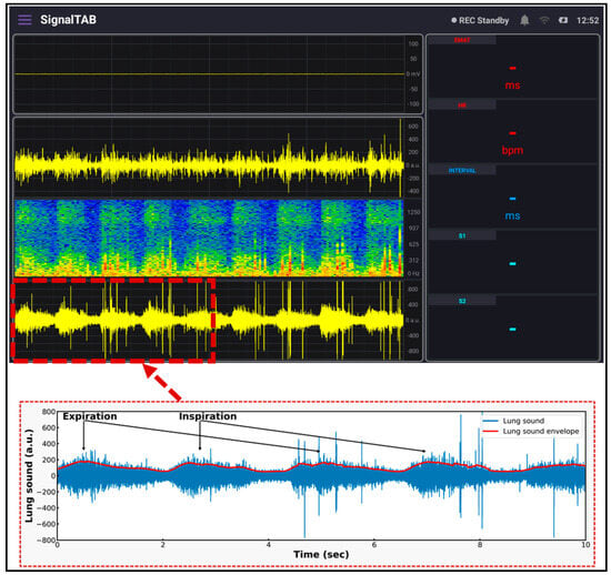 The developed patch sensor was placed on the chest of a volunteer subject to evaluate its performance as a cardiovascular system health monitoring device. Since the auscultation points for the heart sounds are different from those for the lung sounds, the developed patch was placed at two different locations on the chest. First, the heart sounds and the ECG signal were recorded simultaneously by placing the proposed patch sensor on the tricuspid valve auscultation point of the subject’s chest, who was asked to hold their breath during the recording to acquire a neat and less noisy heart sound signal. A continuous and real-time measurement was obtained for 5 min. Figure 11 below shows the measured data. The upper panel in the software shows the ECG signal. Compared to the standard ECG signal, which contains the P wave, QRS complex, and T wave, the ECG signal measured using the developed patch contained all those three components with an almost similar pattern. The upper part of Figure 11 shows a detailed graph of the signal collected after being saved to the tablet. The onset of the QRS complex was marked with the letter Q. The peak-to-peak amplitude of the measured ECG was found to be 300 mV, which is in the normal range for an adult subject [31]. The second panel shows the measured heart sound signal, in which the first and second heart sounds (S1 and S2) are clearly visible. This signal pattern is similar to the standard heart sound signal measured from the tricuspid valve auscultation point. In addition, a detailed graph of the heart sound signal is shown in the upper graph with clarification on how the interval, S1, and S2 intensities were calculated. In addition, the envelope of the signal that outlines its extremes was calculated and displayed. The EMAT value, which is the time difference between the onset of the Q signal and that of the first heart sound, was calculated from the acquired data, and it was found to be 76 ms. This value is physiologically reasonable for healthy adults [32], and it ensures the synchrony of the measured data. The heart rate value calculated was found to be 72 beats-per-minute, which is also within the normal range for healthy adults.