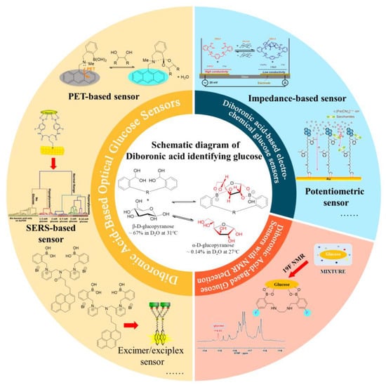 In previous decades, optical sensors have gained significant attention due to their high sensitivity. In biosensing, a variety of sensing mechanisms have been applied in diboronic-acid-based sensors, including intramolecular charge transfer (ICT), photoinduced electron transfer (PET), fluorescence resonance energy transfer (FRET), excimer/exciplex, and surface-enhanced Raman spectroscopy (SERS).