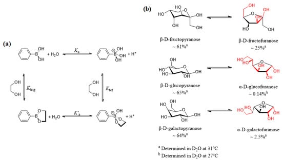 (a) Binding equilibria of phenylboronic acid with a diol [20]; (b) Equilibrium between the dominant form (pyranose, left) and the form that contains a syn-periplanar anomeric hydroxyl pair (furanose, right) of D-fructose, D-glucose, and D-galactose [21].