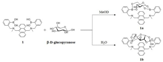 Shinkai et al. developed the first glucose-selective fluorescent diboronic acid sensor 1 in 1994 and proposed a 1:1 binding mechanism between the two boronic acid moieties and two potential binding sites of glucopyranose (Figure 3) [23]. The binding constant of sensor 1 to glucose, measured in 33.3% methanol/H2O at pH 7.77, was 3981 M−1, which was much higher than that of fructose (316 M−1) and galactose (158 M−1). Subsequently, Norrid and Eggert re-examined this work and re-confirmed the conformation of complex 1a under anhydrous conditions. Furthermore, in the presence of water, complex 1a rearranges into the thermodynamically more stable complex 1b, where diboronic acid interacts with α-D-glucofuranose by binding to the cis-dihydroxyl groups at position 1,2 or cis-trihydroxyl groups at positions 3,5,6 (Figure 3) [24]. The glucose-selective diboronic acids share a similar structural arrangement in that the two boronic acid moieties match both the distance between the two potential binding sites of glucose and the orientation of the hydroxyl groups.