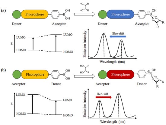 Intramolecular charge transfer (ICT) sensors are a class of fluorescent molecules that possess a push–pull electron system, typically comprising an electron-accepting group (A) and an electron-donating group (D). The change of electron distribution in the D-A system can lead to the shift of fluorescence emission spectra along with the variation in emission intensity (Figure 4) [28]. Fluorophores with boronic acid groups were found to respond to molecules with diol groups.