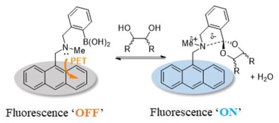 In 1994, Shinkai reported the first PET-based fluorescent glucose sensor (sensor 4, structure shown in Figure 7), which consisted of a benzylamine with a boronic acid group attached at the adjacent position and a fluorescent group, anthracene [33]. As shown in Figure 8, the B-N interaction between the amino nitrogen atom and the boronic acid group is very weak in the absence of the substance, and the lone electron pair on the nitrogen can quench the fluorescence of anthracene by a PET process, so the sensor is in the “off” state. However, the complexation with saccharide increases the acidity of the boronic acid group on sensor 4, and a stronger Lewis interaction between the boron atom and the lone pair of the amine can occur. The B-N interaction triggers the recovery of the inherent fluorescence of anthracene and then is in the “on” state [34,35,36]. However, Sun and coworkers determined that the vibrational-coupled excited-state relaxation instead of B-N interaction plays an important role in the modulation of the fluorophore’s fluorescence [37].