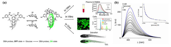(a) Schematic illustration of the sensing mechanism of 9a for glucose and its bioimaging applications in this work. Reprinted with permission from [46]. Copyright 2023 The Authors. Published by American Chemical Society; (b) the emission spectra of sensor 10b with glucose (in PBS buffer/10% MeOH, pH = 7.40, λex = 350 nm). Reprinted with permission from [47]. Copyright © 2023 American Chemical Society.