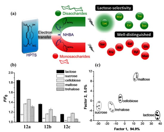 Different from intramolecular PET sensors, the boronic acid-based inter-molecular PET sensors consist of two components, a dye and a dye-quencher. The boronic acid molecule acts as a quencher and an acceptor for the saccharides, and the fluorescence of the dye is modulated by electron transfer from the dye to the quencher/acceptor. Singaram et al. developed an intermolecular PET sensing system using the anionic dye 8-hydroxypyrene-1,3,6-trisulfonic acid trisodium salt (HPTS) and cationic diboronic acid derivatives (11) and reported the identification of monosaccharides and disaccharides with a six-channel, two-component sensor array consisting of 11a–f and HPTS [48,49]. In 2015, Xing and colleagues reported a series of cationic N,N-di-2-picolylamine-derived diboronic acid molecules 12a–c to distinguish six monosaccharides and five disaccharides with anionic HPTS as the fluorescent indicator [50]. Compared with the known diboronic acid receptors based on viologen and phenanthrolinium salt, these molecules have remarkably higher spatial flexibility and a significantly larger pocket for sugar analytes. As shown in Figure 11, a well-separated two-dimensional linear discriminant analysis (LDA) plot demonstrated that the sensor array based on 12a–c can achieve efficient discrimination of various monosaccharides.