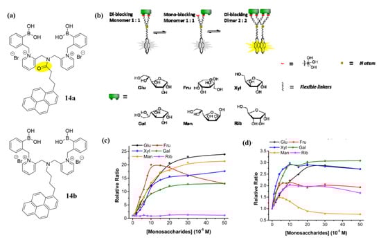 In 2016, Xing et al. reported the synthesis of two water-soluble excimer-based sensors 14a–b that differ only in their flexible aliphatic linkers between the fluorophore pyrene and the diboronic acid moiety [54]. Both 14a and 14b can form pyrene excimers in the presence of monosaccharides. Monomers 14a and 14b had fluorescence emissions at 381 nm, while distinct excimer emissions at 528 and 510 nm, respectively (Figure 13). The two sensors showed different responses to monosaccharides. They also built a four-channel assay using linear discriminant analysis (LDA) to distinguish six monosaccharides within a certain concentration range by monitoring monomer and excimer emissions. This assay accurately detected glucose in artificial urine and blood containing common interferents, proving the effectiveness of the system under physiological conditions.