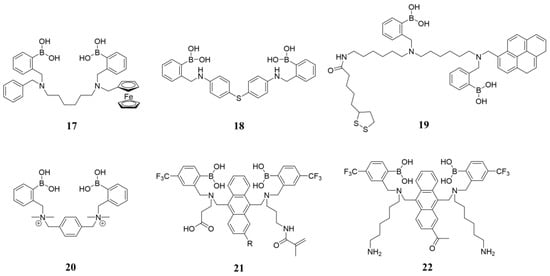 Based on this property, researchers have designed different structures of diboronic acids to improve the selectivity for glucose, enabling their application in glucose detection. In addition, the pseudo-diboronic acid moieties designed by the assembly of two monoboronic acid molecules at precise positions are also able to recognize the two 1,2-diol moieties of D-glucose, such as the supramolecular inclusion complex of γ-cyclodextrin (γ-CD) with two molecules of monoboronic-acid-based receptors [25,26,27]. However, we will not cover pseudo-diboronic acids in this review as we focus on sensors that possess two boronic acid moieties in one single molecule.