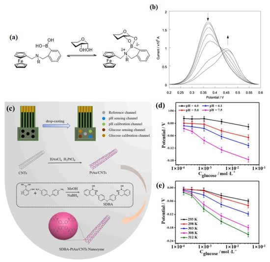 (a) Schematic diagram of the ferrocene-boronic acid bound to saccharide; (b) The DPV of 17 with different concentrations of D-glucose (50 μM in 52.1 wt.% methanol, pH 8.21). Reprinted with permission from [65]. Copyright © 2002 Royal Society of Chemistry; (c) Schematic illustration of MCGP sensing array based on SDBA-PtAu/CNTs nanozyme; (d,e) Response performances of glucose electrode group to glucose at different pH (d) and temperature (e). Reprinted with permission from [66]. Copyright © 2022 Elsevier B.V.