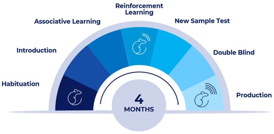A multiphase protocol for training Long–Evans rats using an automatic platform was developed. The training sessions are based on behavioral shape methodology and include several consecutive phases at each described step. Human interaction with the platform begins with a habitat for human touch. This can reduce interaction stress, making it easier to detect desired odors. Next, rodents are introduced to the platform environment and learn how to operate within. The following steps include associated learning and detection reporting. Once they have passed these steps with high performance, they can repeat the action in response to the stimulus. Each training session contains between 35 and 60 separate and consecutive exposures to different urine samples in a predefined sequence.