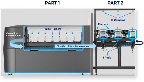 The BSP combines BSs (rats), mechanical components, hardware, software, and a cloud-based database infrastructure (with compliance to data protection). The system is divided into two main parts, as shown in Figure 2. Part one—the “operational area” (Figure 2, left side)—is where the sample tubes are loaded. A conveyor belt with fixed sample holders conveys the urine samples to the BSs’ cages and back. The tube holders are designed to hold a single test tube. The holders keep the open test tube containing the urine sample isolated from the environment except for a hole set to be attached to the exact front location of the sniffing shaft (see explanation below). Part two—(Figure 2, right side) the “testing area”—consists of 3 fixed identical pods (see Figure 3) for 3 separate and independent BSs.