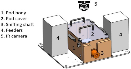 Each pod holds a BS while it assesses the urine samples through a sniffing shaft. Each BS can assess a single sample at a time, and up to three samples can be assessed simultaneously by the platform. Each pod console comprises the pod body, two feeders, and a sensor wall.
