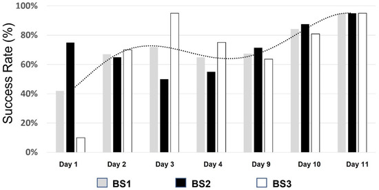 During the training, we analyzed and measured various performance parameters including NPV, PPV, sensitivity, and specificity to create and maintain the biosensor performance standard. If the animal did not reach the required standard, it would not be allowed to proceed to the next phase in the training protocol. This ensures that only animals that are properly trained and meet the criteria are allowed to participate in the testing, and while performance variations do occur, all are within the predefined standard. An example of the advancement of a BS during their training is shown in Figure 4. As can be seen, the success rate of each BS increases as sessions are repeated daily. A clear increase trend in each of the BSs’ performances is seen over time (dotted line).