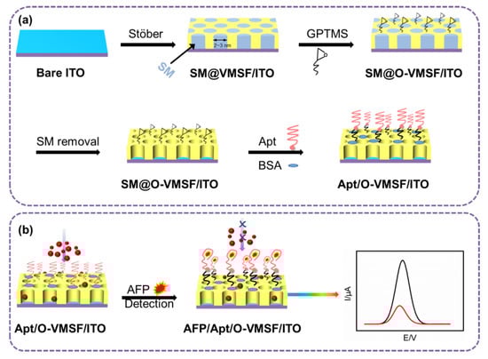 VMSF/ITO based electrochemical aptasensor for AFP detection was constructed as the procedure shown in Figure 1a, which involved in the surface modification of GPTMS and AFP-specific aptamer. Firstly, the SM@VMSF/ITO electrode was placed into ethanol solution containing 0.052% (v/v) GPTMS for 1 h, allowing the modification of GPTMS on the outer surface of SM@VMSF/ITO based on the silanization reaction and producing epoxy groups for further functionalization. Subsequently, in order to remove the micelles from the nanochannels of VMSF, the resulting electrode was stirred in HCl-ethanol (0.1 M) solution for 5 min to obtain GPTMS modified VMSF/ITO, named as O-VMSF/ITO electrode. Secondly, the AFP aptamer (50 μL, 0.1 μM) was dropped onto the surface of O-VMSF/ITO at 4 °C for 2.5 h. After the residual aptamer was washed with PBS (0.01 M, pH = 7.4), BSA (0.5%) was used to block the nonspecific active sites at 4 °C for 0.5 h. Finally, the constructed electrochemical aptasensing interface was called Apt/O-VMSF/ITO.
