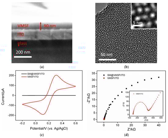 Figure 2. Cross-sectional SEM (a) and top-view TEM (b) images of VMSF. (c) CV curves obtained at SM@VMSF/ITO and VMSF/ITO electrodes in 0.1 M KCl solution containing 2.5 mM K3Fe(CN)6/K4Fe(CN)6. (d) Nyquist plots of SM@VMSF/ITO and VMSF/ITO electrodes obtained in 0.1 M KCl solution containing 2.5 mM K3Fe(CN)6/K4Fe(CN)6.