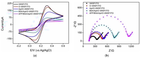 Figure 3. CV curves (a) and EIS plots (b) of VMSF/ITO, O-VMSF/ITO, Apt/O-VMSF/ITO, BSA/Apt/O-VMSF/ITO and AFP/BSA/Apt/O-VMSF/ITO electrodes obtained in 0.1 M KCl containing 2.5 mM K3Fe(CN)6/K4Fe(CN)6. The concentration of AFP is 1 ng/mL.