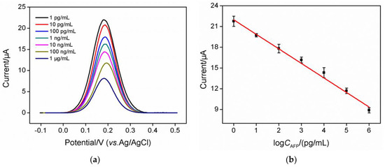 Figure 5. (a) DPV curves of the developed electrochemical aptasensor in the presence of different concentrations of AFP (1 pg/mL–1 μg/mL). (b) Corresponding calibration curve.
