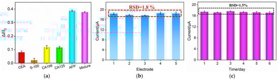 Figure 6. (a) Electrochemical responses of BSA/Apt/O-VMSF/ITO sensor to CEA, S-100, CA199, CA125, AFP or their mixture. I0 and I denote the anodic peak current before (I0) and after (I) incubation with AFP or other antigens and ΔI = II0. The concentration of AFP and other proteins are 0.1 ng/mL and 1 ng/mL, respectively. (b) Anodic peak currents obtained at five different electrodes. (c) Stability of the developed electrochemical aptasensor after storage for different days. The concentration of AFP in (b,c) is 1.0 ng/mL.