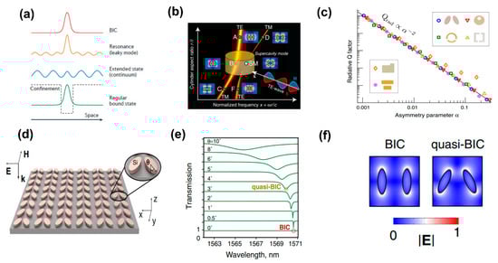 Fundamentally, BIC is a type of mode that exists within the radiation continuum without emitting radiation. The profile of the modes used to depict the BIC state gives a clear indication of the overall picture. Extended states are present throughout a wide range of frequencies (Figure 5a, blue) [80]. Discrete levels of bound states have no emitted flux (Figure 5a, green), and this is the situation with an atom’s bound electrons at negative energies. Because of a confining structure or potential, the bound states are spatially localized (Figure 5a, black dashed line). Resonances that locally mimic a bound state within the continuum can be discovered; however, they really couple to the extended waves and leak out (Figure 5a, orange). BICs are located within the continuum but are fully localized and leak-free (Figure 5a, red).