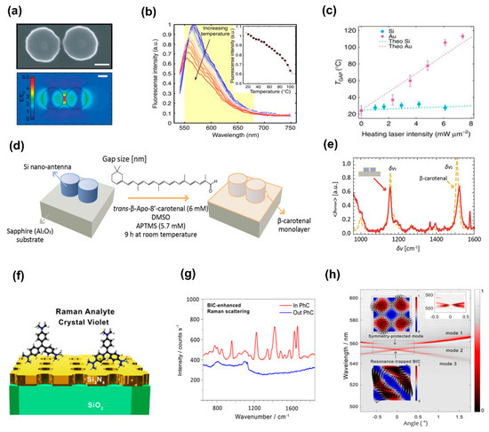 Sensing based on surface-enhanced Raman spectroscopy. (a) Dielectric metasurface using Si−dimer nanoantennas employed to improve the Raman scattering signal of polymer films. (b) Nile Red emission spectra at varying temperatures with the detection range marked (550–680 nm). (c) Temperature measurement in the gap for gold (magenta) and Si (cyan) nanoantennas as a function of the heating laser’s intensity at 860 nm. (a–c) Reproduced with permission from [76]. Copyright © 2015, The Author(s). (d) Si-dimer nanoantenna-based all-dielectric metasurface functionalized β-carotenal on an alumina substrate. (e) Enhancement of the SERS signal of the β-carotenal monolayer. (d,e) Reproduced with permission from [54]. Copyright © 2018 American Chemical Society. (f) All-dielectric metasurface based on silicon nitride nanopores provide for the quasi-BIC mode. (g) Raman scattering spectra of the internal and external crystal violet molecule of the photonic crystal metasurface. (h) Drawing of the dispersion bands derived from TE transmission spectra. (f–h) Reproduced with permission from [138]. Copyright © 2018 American Chemical Society.