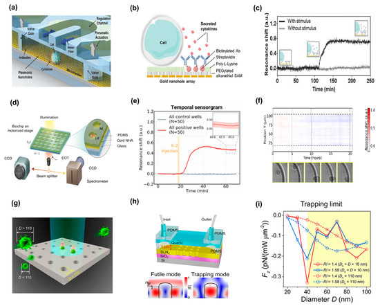- Li, X.; Soler, M.; Szydzik, C.; Khoshmanesh, K.; Schmidt, J.; Coukos, G.; Mitchell, A.; Altug, H. Label-free optofluidic nanobiosensor enables real-time analysis of single-cell cytokine secretion. Small 2018, 14, 1800698. [Google Scholar] [CrossRef] [PubMed]