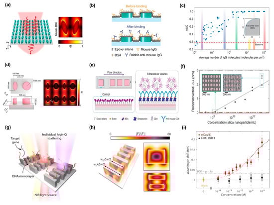 The phenomenon of electric and magnetic Mie-type resonances can be observed in high-index dielectric resonators, which possess the ability to be precisely tailored by manipulating the geometry of meta-atoms. The concept of bound states in the continuum (BICs) can be utilized to localize electromagnetic energy within subwavelength resonators. This is accomplished by achieving destructive interference between two leaky modes [49]. The utilization of metaphotonic nanostructures, comprising both metals and high-RI dielectrics, enables the significant enhancement of electromagnetic near-fields, which leads to an increase in light–matter interactions. Therefore, resonant metaphotonic systems have the essential characteristics in the creation of biosensing platforms. Biosensors have captured the attention of researchers due to their ability to address the constraints encountered in current bioanalytical techniques, such as the sensitivity, selectivity, and detection limit. However, a few applications of biosensors utilizing metaphotonic responses have been reported. For example, Wang et al. have focused on the underlying physical sensing mechanisms by plasmonic metasurfaces and highlight recent advancements in their application for cancer detection and COVID-19 detection [50]. Furthermore, Oh et al. provided a concise overview of nanophotonic sensing principles that rely on van der Waals (vdW) materials. Afterwards they proceed to discuss the subsequent technological hurdles, including surface chemistry, integration, and toxicity [51].