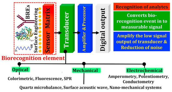 One of the most promising tools for virus detection is biosensor-based analysis methods. Biosensors consist of a biologically sensitive element (receptor), a transducer, and a working solution (Figure 3).