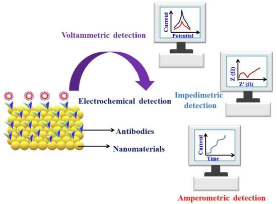 Kumar et al. [50] showed the prospects for the application of electrochemical sensors in virus detection. Amperometric immunosensors, which combine the principles of voltammetry with immunological responses, are highly sensitive in detecting immune interactions. Figure 4 shows the electrochemical techniques used for SARS-CoV-2 detection [50].