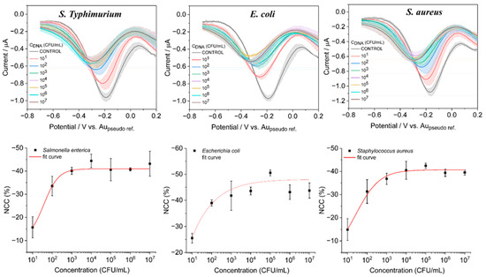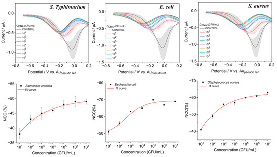 3.4. Analytical Performance of the Sensor for Quantification of Bacterial Types with DPV