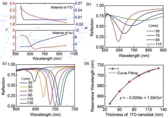 Figure 1a illustrates the schematic and geometric parameters of our proposed ultra-narrow-band biosensor. ITO nanodisks arranged in hexagonal arrays are integrated into the gold substrates, producing ITO–Au nanodisk arrays. The period of the unit cell is P. The diameter and thickness of the nanodisk are D and t, respectively. The permittivity of Au and ITO in the visible and near-infrared regions are obtained from experimental results. We obtained the refractive index (n) and extinction coefficient (k) of the material using ellipsometry, as shown in Figure 2a. The refractive index of the silica substrate is 1.46.