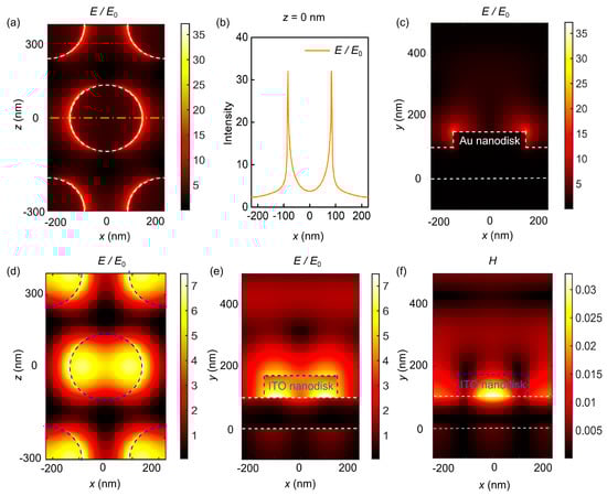 Electromagnetic field distribution of resonance wavelengths. For the full metal nanodisk arrays, electric field distributions (a) in the xz plane for y = 150 nm, (b) the variation along z direction of orange dotted line, and (c) in the xy plane. For the ITO–Au nanodisk array structure: electric field distributions in (d) xz plane for y = 170 nm, (e) the xy plane, and (f) magnetic field distribution in the xy plane. The white dashed line indicates metal material, while the blue dashed line indicates ITO material.