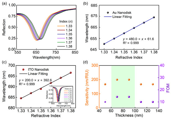 As shown in Figure 4, we have calculated the reflection of proposed structure with a cover layer for different refractive indices. For the full-metal nanodisk arrays, the position of the dip has redshift from 650 nm to 675 nm when the ambient refractive index increases from 1.33 to 1.38 (Figure 4a), while the value of the reflective dip and the line shape of the resonance remains constant. Figure 4b extracts the positions of reflection dip from Figure 4a to plot them as a function of the refractive indices, and represents the blue line as the line fitting. The slope of resonance mode is 480 nm/RIU, and the bulk FOM is 6.67. For the ITO–Au nanodisk arrays, the inset of Figure 4c demonstrates the dependence of the reflection spectra on the change in the ambient refractive indexes. Additionally, the resonance wavelength has a redshift with the increase in the ambient refractive index from 1.33 to 1.38, and the line shape of the spectra remains constant, as illustrated in Figure 4c. The slope of plasmonic resonance is 200 nm/RIU and the bulk FOM is 14.28 when the thickness is 70 nm, which is twice the sensitivity of the full metal nanodisk arrays. Furthermore, we discuss the changes in sensitivity and FOM under different thicknesses. The results show that the values remain unchanged in the range of 70–90 nm, which greatly improves the tolerance of our proposed structure to the preparation process (Figure 4d).