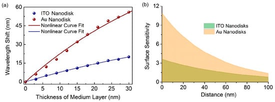 In essence, bulk sensitivity describes the measurement of accessible field regions from the surface of nanostructure sensors to infinity. Nevertheless, it is inappropriate for biological molecules, such as proteins, DNA, and viruses. In order to more accurately judge the performance of sensor response, the surface sensitivity is used for evaluation. It describes the change caused by the refractive index of the thin layer near the sensor surface. To quantify the performance of sensors, a molecular layer with a refractive index of 1.45 is covered on the surface. We investigate the spectra of reflection with varying thicknesses of molecular layer. Obviously, the resonance wavelengths of both structures undergo redshift as the thickness of the protein layer increases from 0 to 30 nm. The dependence of resonance wavelength on the distance from surface is considered, so we fit the data in Figure 5a to exponential curves. The formula is as follows [19,24]: