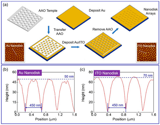 To experimentally investigate the sensitivity of our proposed nanostructure arrays on Au substrate, we utilized a template transfer and magnetron sputtering fabrication scheme, as illustrated in Figure 6. The AAO template has good periodicity, which is consistent throughout the preparation of full-metal nanodisk arrays, with the only difference being the second deposition of metal film. White line profiles across the patterns are shown in Figure 6b,c; these indicate the thickness of the nanodisks in the two prepared structures (i.e., 50 nm for gold nanodisks and 70 nm for ITO).