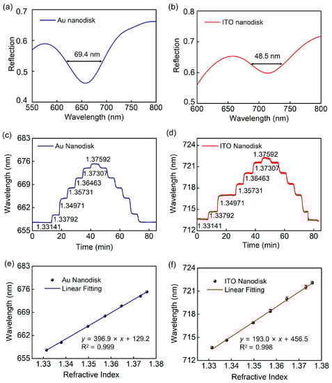 We used a home-built reflective spectral detection system, including a light source, spectrometer and the LabVIEW program, to achieve sensing detection and data acquisition. Figure 7 shows the reflection spectra and wavelength response of two structures under normal incidence. Figure 7a,b reveal that the resonance wavelength and FWHM are 660 nm with 69.4 nm for full-metal nanodisk array, and 712 nm with 48.5 nm for ITO–Au nanodisk array, respectively. However, the bandwidth is notably wider compared to the simulation results, due to the experiment’s template quality. The sensitivity was evaluated by changing the refractive index of the measured sodium chloride solution, which was measured using an Abbe refractometer. The prepared structures have been immersed in different concentrations of refractive indices ranging from 1.3314 to 1.3759. As the refractive index increases, the position of the resonance wavelength experiences redshift, as displayed in Figure 7c,d. The relationship between the refractive index and resonant wavelength assumes linear fitting, as demonstrated in Figure 7e,f. Additionally, the sensitivity of the full-metal nanodisk arrays is SAu = 396.0 nm/RIU, while that of the ITO–Au nanodisk arrays is SITO = 193.0 nm/RIU.
