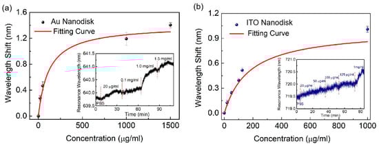 The aforementioned method is applicable to thiol modification interactions with gold material, but not to ITO material. Therefore, in order to detect IgG proteins for the ITO–Au nanodisk arrays, we utilized a positive and negative charge adsorption. The IgG displays a positive charge with a PH < 6.9, and a negative charge with a PH > 6.9 [29,30]. In addition, PDDA was utilized as a strong cationic polyelectrolyte layer. The detection process involves immersing the sensor chip in PDDA solution with a 1% mass fraction for 15 min, and then cleaning the surface with deionized water. We then immobilized anti-IgG with 1 mg/mL on the sensor surface using electrostatic adsorption for 30 min, followed by cleaning with PBS solution. Finally, termination processing was carried out using BSA solution. IgG samples with different concentrations were detected. Similarly, the resonance wavelength redshifts as the concentration increases in ITO nanostructures. Through calculation and fitting, the equilibrium dissociation constant and the maximum wavelength shift were found to be 180 μg/mL and 1.00 nm, respectively (Figure 8b). The results indicate that biosensing can be achieved through plasmonic full-metal nanodisk arrays and ITO–Au nanodisk arrays, which helps to optimize sensing performance and enriches detection systems.