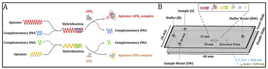 Aptamer-based microchip capillary electrophoresis for trace AFB1 and OTA (Reproduced with permission from [51]). (A) The measurement procedure of mycotoxin-aptamer complex formation. (B) Separation of nucleic acid on MCE-LIF platform.