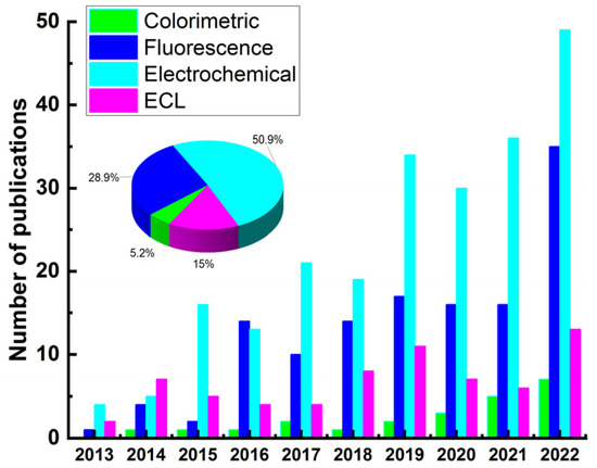 Figure 2 illustrates the detection techniques reported in the last ten years (2013–2022) for the detection of some typical mycotoxins (aflatoxin, ZEN, OTA, fumonisin, DON) based on sensors. Results were obtained from SciFinder using abstract/keyword “fluorescence”, “colorimetric”, “electrochemical”, and “ECL”, respectively. Although the percentage of total publications for mycotoxin detection using ECL sensor is lower than that of electrochemical and fluorescence sensors, ECL exhibits potential advantages over other optical-based methods because it does not require excitation light source, which not only simplifies the experimental setup but also eliminates the background response of luminescent impurities and scattered light [53]. ECL reactions are potential-controlled, making them controllable and simple operations. Owing to these merits, ECL technology has become one of the most suitable analytical tools for trace target detection in food, environment, disease diagnosis, and so on. According to the recognition elements used, the ECL biosensors could be divided into three categories, including antibodies [54,55,56,57,58,59], aptamers [27,60,61,62,63], and molecular imprinting polymer (MIP) [26,64,65,66].
