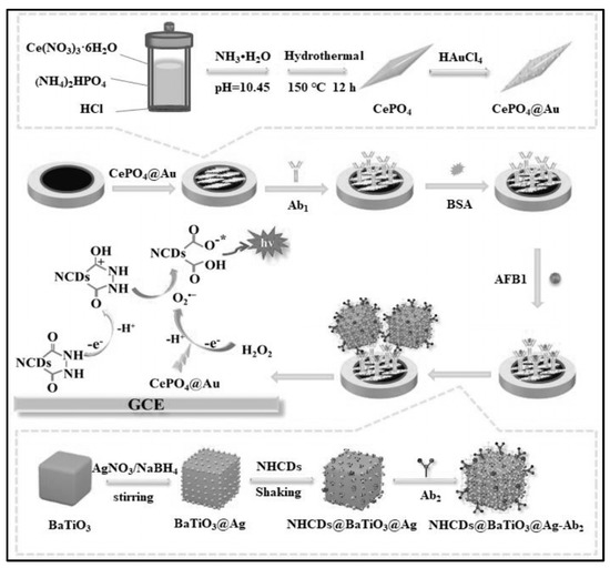 Li’s group established a sensitive sandwich-type ECL immunosensor for AFB1 detection by integrating a synergistic co-reaction acceleration strategy (Figure 3) [67]. CePO4@Au was modified on Glassy carbon electrode (GCE) which could provide a large surface area for the decoration of bio-recognition elements (Ab1). Additionally, CePO4@Au can catalyze the decomposition of H2O2 into O2•−. The produced O2•− further reacts with nitrogen-doped hydrazide conjugated carbon dots radicals (NHCDs•), thereby greatly amplifying the ECL signal of NHCDs. To further amplify the ECL signal, BaTiO3@Ag nanoparticles with excellent conductivity were synthesized which not only provided anchor sites for the immobilization of antibody (Ab2) but also served as an efficient carrier for the modification of NHCDs. The optimal reaction time between antibody and AFB1 was 1 h. The constructed biosensor can achieve the accurate detection of AFB1 in the range of 0.01 pg/mL–100 ng/mL, and the detection limit was 9.55 fg/mL.