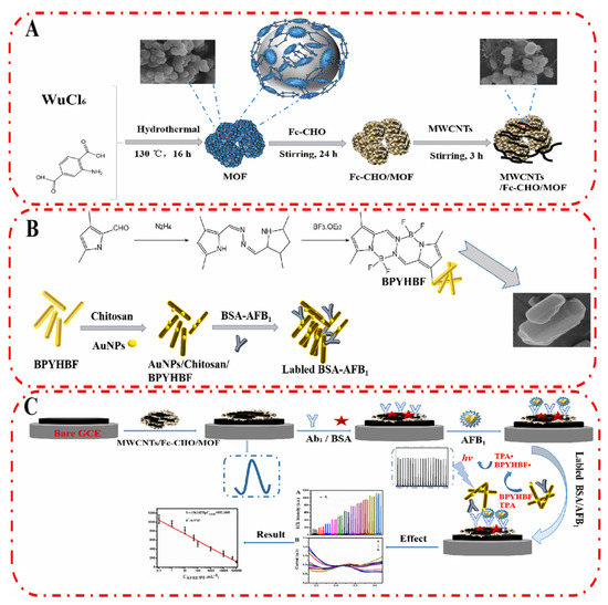 Ratiometric electrochemiluminescence/electrochemical strategy for the ultrasensitive detection of AFB1 (Reproduced with permission from [68]). (A) Fabrication process of MWCNTs/Fc-MOF. (B) Preparation of labeled BSA-AFB1. (C) Fabrication process of biosensor.