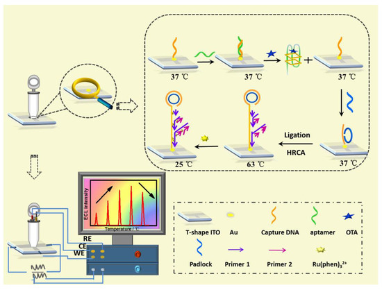 Lin et al. developed an ultra-sensitive ECL biosensor using hyperbranched RCA strategy for in situ monitoring of OTA (Figure 5) [74]. CDNA was immobilized on ITO electrode, and then, the temperature of the electrode was raised to 37 °C for the hybridization of aptamer. In the presence of target (OTA), the formation of OTA-aptamer complex caused the release of aptamer from electrode surface, which activated the RCA process. After the extension of DNA sequence and the formation of long dsDNA on electrode surface, a large amount of ECL molecules (Ru(phen)32+) could intercalate into the groove of dsDNA, producing an improved ECL signal.