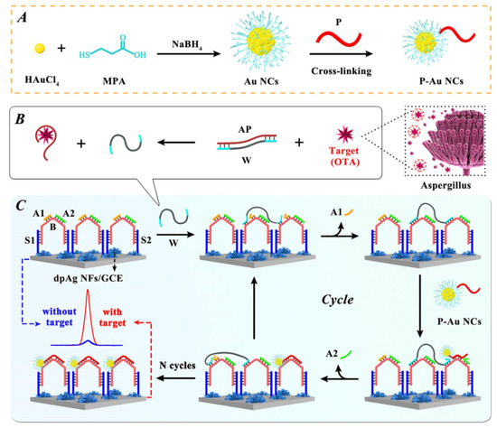 Non-enzymatic ECL biosensor for the detection of OTA based on the efficient amplification strategy of DNA walker (Reproduced with permission from [80]). (A) Preparation of monodispersed MPA-Au NCs. (B) The target transformation process. (C) Schematic diagram of proposed ECL biosensor for OTA detection.