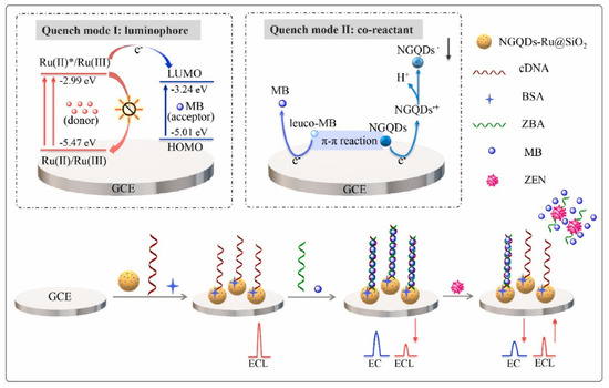 - Luo, L.; Liu, X.; Bi, X.; Li, L.; You, T. Dual-quenching effects of methylene blue on the luminophore and co-reactant: Application for electrochemiluminescent-electrochemical ratiometric zearalenone detection. Biosens. Bioelectron. 2023, 222, 114991. [Google Scholar] [CrossRef] [PubMed]