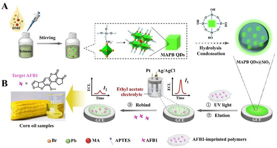 The preparation (A) and working (B) process of MAPB QDs@SiO2-based MIP-ECL sensors for AFB1 detection (Reproduced with permission from [100]).