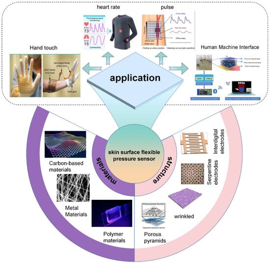 In this paper, we will discuss the materials, structures, latest applications, and integration aspects of the back-end circuitry of the epidermal pressure sensing array, as shown in Figure 1. First, we summarize the materials and fabrication processes commonly used to prepare pressure sensing arrays and analyze the advantages and disadvantages of various materials and fabrication processes. An overview of the microstructures of the sensing arrays and their various applications on the skin surface is presented in Section 3 and Section 4. Subsequently, the latest research on the integration of sensing arrays with back-end circuits is outlined in Section 5. Finally, we discuss the future challenges and trends of pressure sensing arrays. We hope that this review will improve a comprehensive and systematic understanding for future researchers and provide them with ideas for the future design and development of pressure sensing arrays.