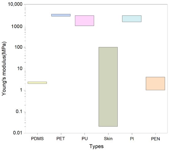 The substrate material of the flexible sensing arrays plays an important role in the manufacturing of the sensing arrays, and the selection of a suitable substrate material can help the sensing arrays obtain better performance. The epidermal flexible pressure sensing arrays are in direct contact with human skin, so they must have extraordinary ductility to make them fit the skin more perfectly [40].