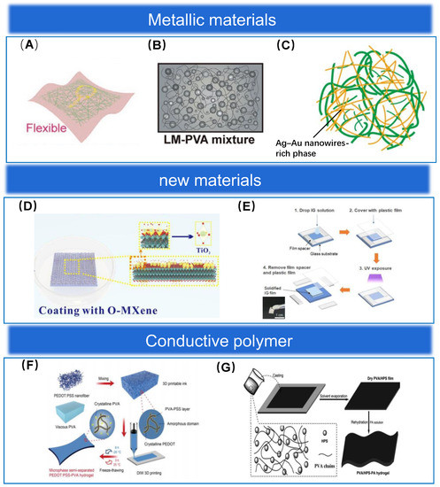 (A) gold nanoflowers (AuNFs) schematic diagram. Reprinted with permission from John Wiley and Sons [53]. (B) Liquid metal−polyvinyl alcohol (LM−PVA) mixture. Reprinted with permission from Elsevier [21]. (C) Silver (Ag) and gold (Au) nanowire composites. Reprinted with permission from Springer Nature [54]. (D) Coating with O−MXene. Reprinted with permission from John Wiley and Sons [55]. (E) Fabrication method of ionic−gel (IG) membrane. Reprinted with permission from Elsevier [56]. (F) Principle and fabrication process of the PEDOT:PSS−PVA conducting polymer hydrogel. Reprinted with permission from John Wiley and Sons [57]. (G) Schematical illustration of the fabrication process for composite hydrogels. Reprinted with permission from Elsevier [58].